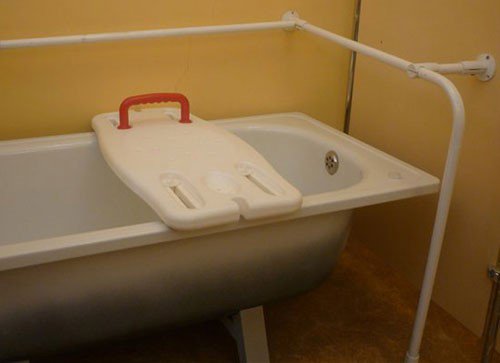 Существуют специальные поручни, крепящиеся с боковой части ванны. За них удобно держаться (и подтягиваться) при пересаживании из инвалидной коляски в ванну и обратно. Физически крепкие люди с помощью такого приспособления могут самостоятельно принимать ванну. Причем процесс пересаживания занимает у них минимум времени.