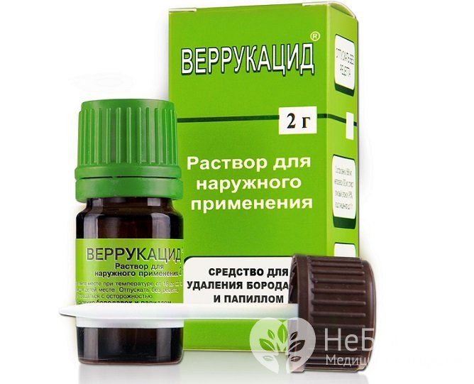 Веррукацид обладает прижигающим действиемВыпускается в форме жидкости, содержащей гидроокись калия и натрия. Относится к сильным раздражающим средствам. Для лечения бородавок требуется наносить лекарственное средство 1-2 раза в день на протяжении 5 дней. Недопустимо с его помощью удалять образования на коже лица.